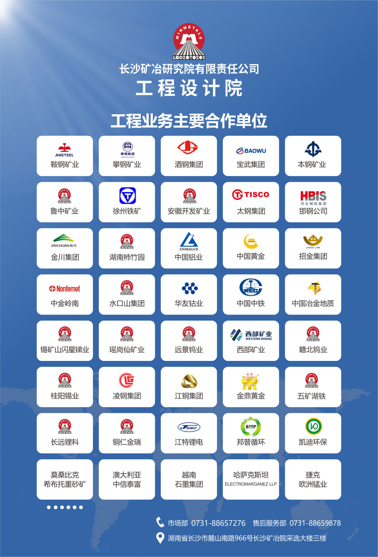 院工程业务始于1985年,拥有冶金行业、化工工程、建筑工程、环境工程及工程咨询评价等工程设计和咨询资质,长期从事冶金矿山、新能源材料和环保等行业的工程咨询、工程设计及工程总承包业务,业务遍及全国以及南美洲、欧洲、非洲、东南亚和澳大利亚等地区。